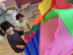 皆で集まって座り、保育者がその上で音に合わせて動かしたりする事もあります