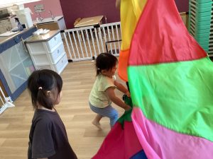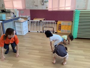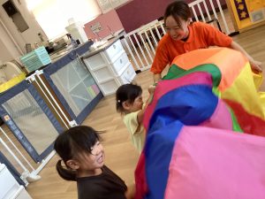 皆で集まって座り、保育者がその上で音に合わせて動かしたりする事もあります