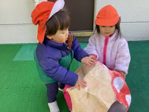2歳児クラスのお友だちは、ビニール袋にお絵かきをして凧を作りました