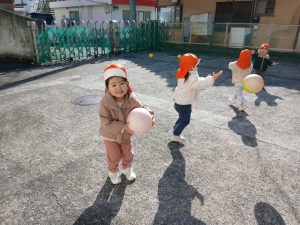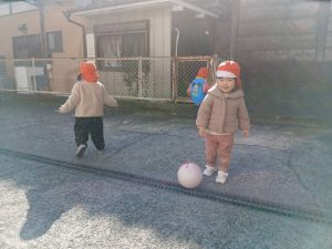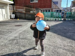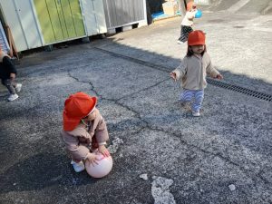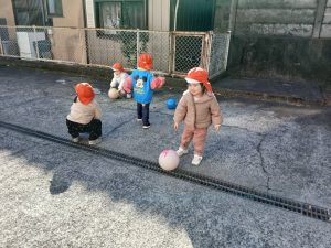 登園の送迎時間が終わり、園舎裏の駐車場でボール遊びをしました