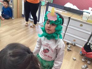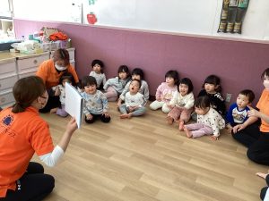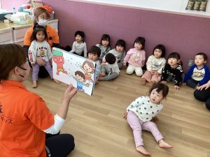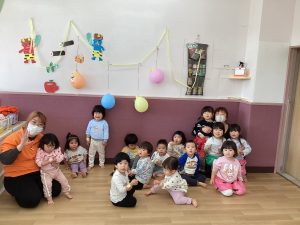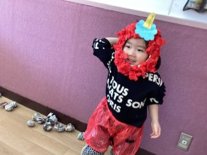 お顔が見えるお面だったので、0歳児クラスと1歳児クラスのお友だちもあまり怖がらずに参加することが出来ました