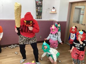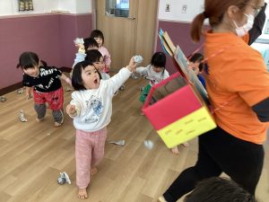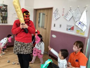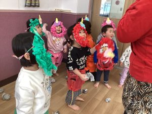 2歳児クラスのお友だちは、自分達で作ったお面をつけて【おに役】をしましたよ