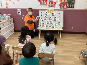 ひな祭りの由来をお話ししたり、一緒に飾るひしもちの意味を教えてもらいました