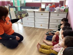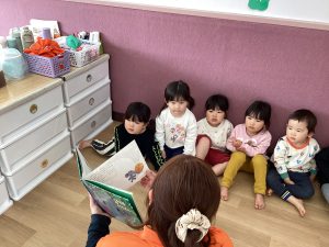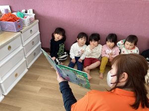 絵本を読み始めると「ぐるんぱってどれー?」と興味津々の子どもたち![]()