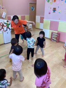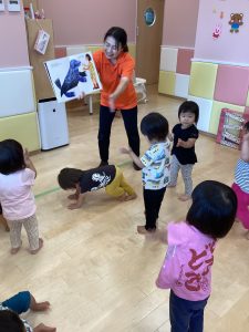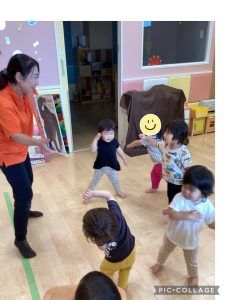 音楽🎵に合わせてまねっこダンス🎶「できるかな?」です✨おさるさんみたいに両手ブラブラできるかな😄?