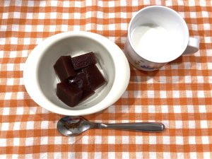 おやつは、水ようかんでした。子どもたちは冷たい水ようかんを、スプーンですくい口まで運んでいました。