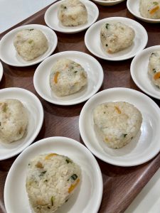 (写真は普通食です。年齢によって盛り付け量を変えて、提供しています。)