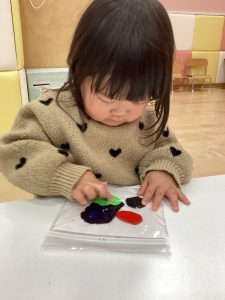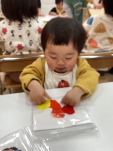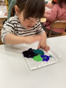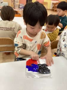 紙に好きな色をのせて袋の上からギュッとすると…どんどん模様が変わるね!