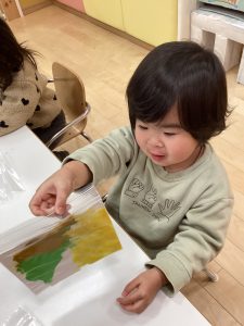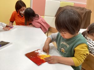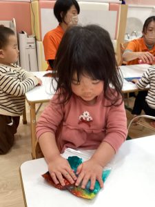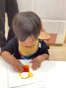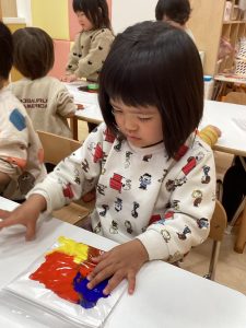 昨日は雨だったのでお部屋でフィンガーペインティングをして遊びました☝️