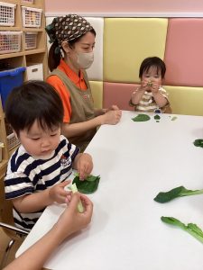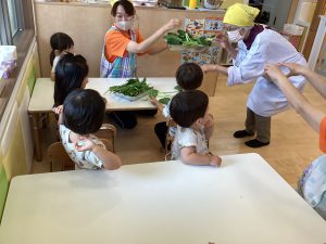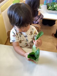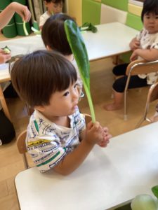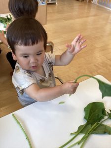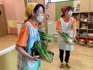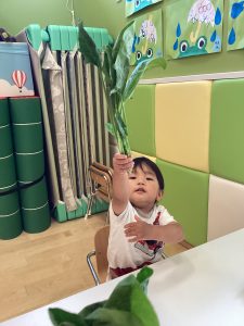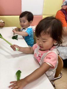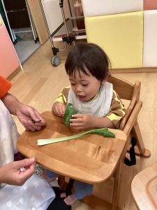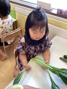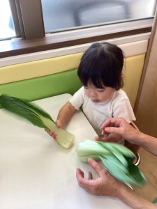 今日の給食『小松菜』をちぎるお手伝いをしてもらった様子をお届けします!