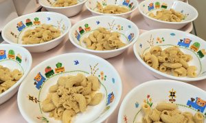 (写真は離乳食後期です。年齢によって形、固さ、盛り付け量を変えて、提供しています。)