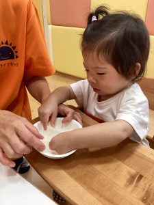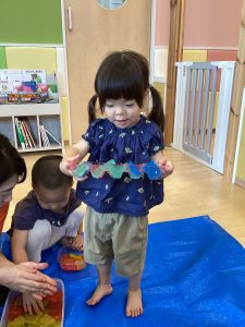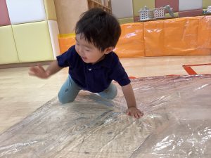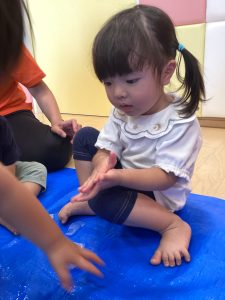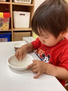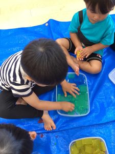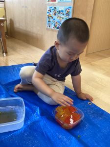 りんご組さんは今年度2回目の寒天遊びなので、遊び方もそれぞれ工夫していました。美味しそうなゼリーを作って、保育者にどうぞ!と渡してくれる子どももいましたよ💕