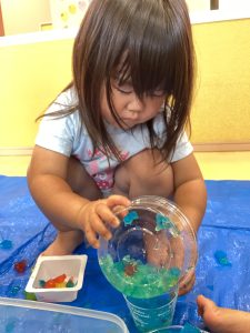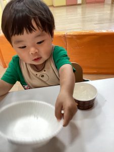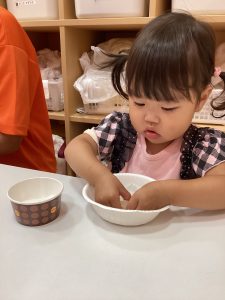 もも組、いちご組さんは初めて寒天遊びをする子もいて、はじめは慎重にツンツン…。。様子を見ていた子も慣れてくると手で握ったり、スプーンですくって容器に入れたりと思い思いの方法で遊んでいました。