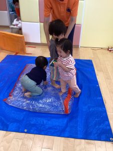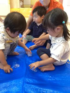 ブルーシートの上で、氷を触って冷たい感覚を味わいます。