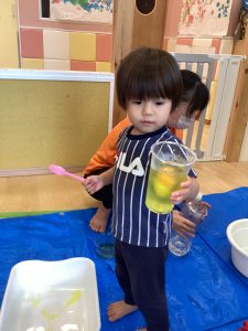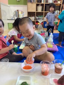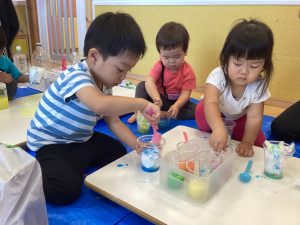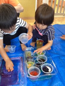 色水遊びではみんな思い思いに遊びました。ジュース🥤やかき氷🍧も作りましたよ☺️