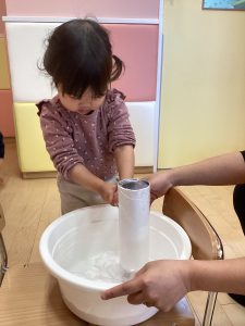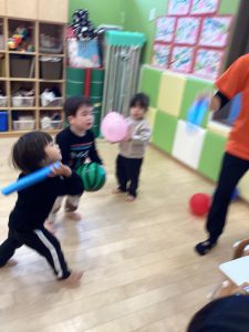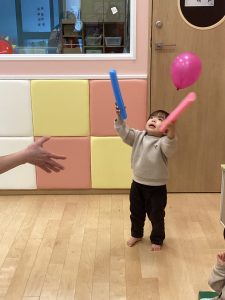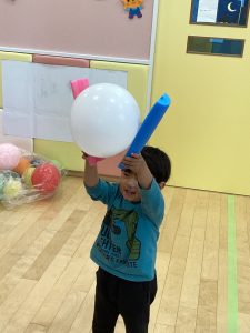 りんご組さんがプールスティックを使って風船キャッチを楽しんでいました!