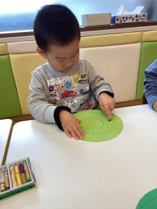 りんご組さんはヘビの形の凧をハサミで切って作っていました。