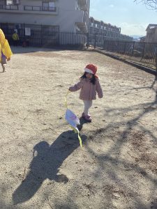 作った凧を、大きく広い南条公園で凧揚げをしましたよ。いっぱい走って、揚がっている凧を見ると、とっても嬉しそうな子どもたちでした!