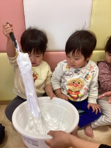 ほう酸、洗濯糊、シェービングでできたお餅に大興奮の子どもたち!
