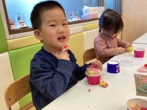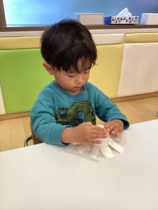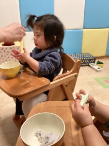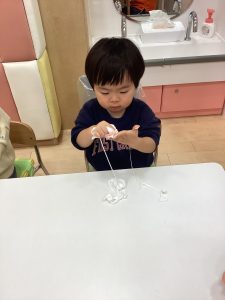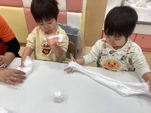 もも組さんとりんご組さんが小麦粉粘土で遊んでいましたよ。