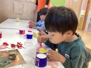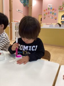 いちご組さんは牛乳パックで、りんご組さんは紙コップを使って作っていました🖋