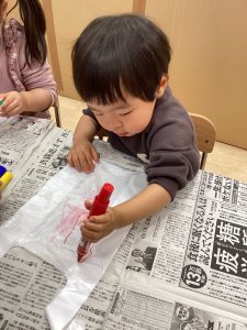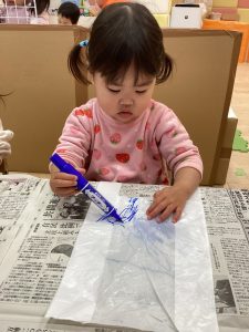 いちご組さんはビニール袋にお絵かきをして凧を作っていましたよ。