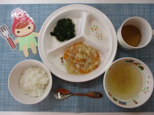 (写真は離乳食後期です。年齢によって形、固さ、盛り付け量を変えて、提供しています。)