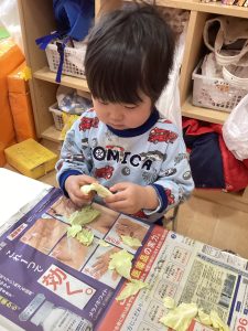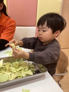 給食の先生のお手伝いに、キャベツを剥いて小さくしてくれましたよ。
