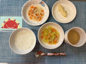 (写真は離乳食後期です。年齢によって形、固さ、盛り付け量を変えて、提供しています。)
