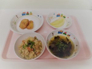 *まぜごはん *すまし汁 *白身魚のフライ *りんご