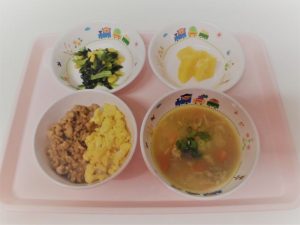 *焼きそば *じゃが芋とワカメの味噌汁 *ほうれん草の胡麻和え *みかん缶