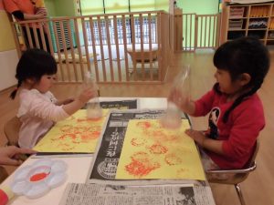 吹き流しは、3色の絵具を使ってフィンガーペインティングをしましたよ。