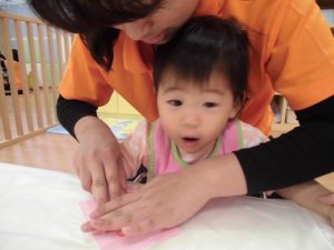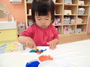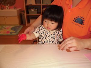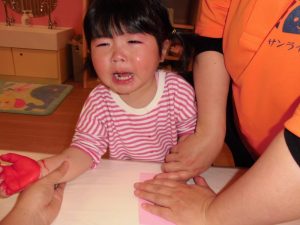 いちご組になると、保育者と一緒に楽しんで取り組む子や、手に絵具がつくのが嫌で泣き出す子など