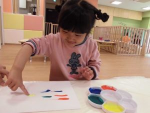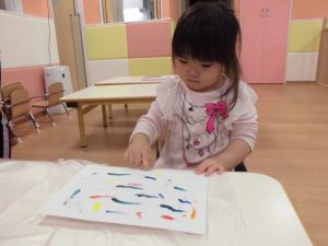 吹き流しは、1歳児と同じく3色の絵具を使ってフィンガーペインティングをしましたよ。