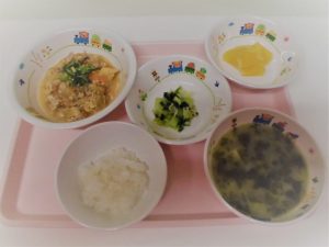 *ごはん *親子煮 *じゃがいもの味噌汁 *じゃこ炒め *オレンジ