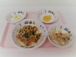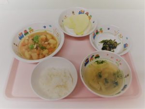 *わかめごはん *豚汁 *煮魚 *ひじきの煮物 *パイン缶