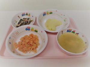 *チキンピラフ *豆腐とネギの味噌汁 *わかめの酢の物 *りんご