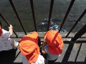 そのまま下を向くとコイがたくさん、たくさん泳いでみんなのところへ来てくれました!!