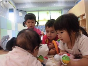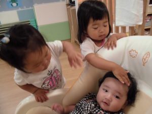 6月には4か月と9か月のお友達が入園し、いちご組とりんご組のお兄さんお姉さんは小さな赤ちゃんに興味津々(‘ω’)ノ