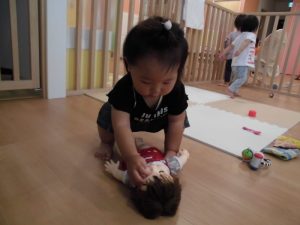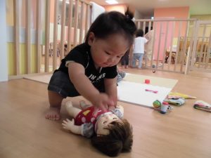 なぜかお洋服が脱がされていることの多いポポちゃんですが。。。(着せても着せても直ぐに脱がされてしまうポポちゃんです。)抱っこしてあやしたり、ご飯を食べさせたり、先生に『ポポちゃんを抱っこしてあげて』と頼んだり、小さなお母さんとお父さんは大忙しです!!