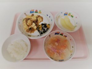 *ごはん *マーボー豆腐 *中華スープ *酢の物 *りんご