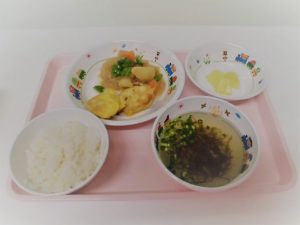 *ごはん *ささみのピカタ *ツナとジャガイモの煮物 *もずくスープ *パイン