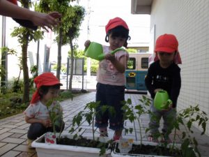 サンライズキッズ小田原園では、5月にミニトマトの苗を買ってきてりんご組のみんなでプランターへ苗を植えました。