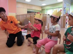 『今日はお誕生児のみんなにお手伝いしてもらい、ペットボトルに入っているお水をジュースに変えてもらいます!!』と言うと『ジュースだって』『わ~、飲みたいね』と早くも大歓声。
