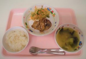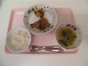 <幼児食> *ごはん *みそ汁 *生姜焼き *おくらとキャベツのごま酢和え ...