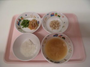 2018.08.14|給食ピックアップ 8月14日の給食☺ <幼児食> *ごはん *みそ汁 *魚の甘酢焼き *そぼろ煮 *インゲン塩ゆで <離乳食> *ごはん *みそ汁 *煮魚 *野菜の煮物 *インゲン塩ゆで 前へ 次へ