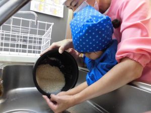 調理の先生と一緒に、お米の中に手を入れてかき混ぜたり、お米がこぼれないように手で支えながら研いだ水を流していました。透明だった水が、研ぐ事で白く濁った水に変化する様子を不思議そうな表情で見つめていました。