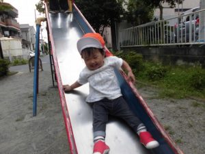 始めは階段の高さに、なかなか初めの一歩が出ませんでした。保育者と一緒に登ると、滑り台の高さに驚いて動きが止まっていましたが、何回も繰り返していくうちに、、、