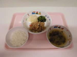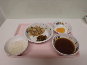 *ごはん *玉ねぎの味噌汁 *鶏肉のすき焼き風 *おかか和え *みかん缶