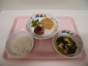 *ごはん *豆腐とワカメのみそ汁 *お月見バーグ *炒めビーフン *きゅうりのポリポリ